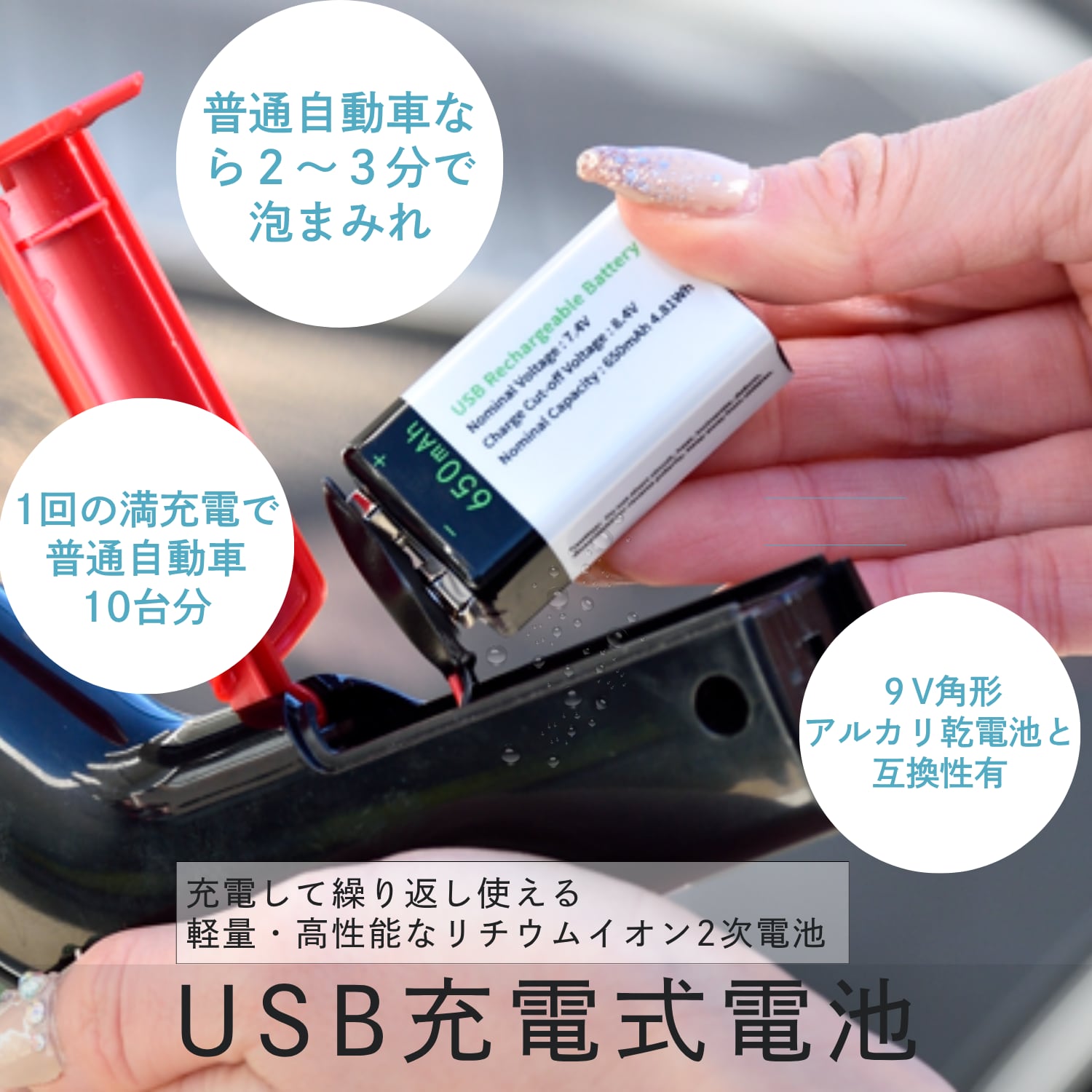 【USB充電池】 1回の満充電で、普通自動車約10台分をしっかり泡洗浄可能 繰り返し充電できる軽量・高性能リチウムイオン二次電池を採用 9V角形アルカリ乾電池と互換性があり、フォームガン未使用時は他の機器にも流用可能 普通自動車なら約2〜3分で泡まみれに!(※本体性能による目安)